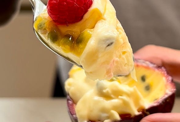 2. Put the mixture inside the half passionfruit shells - set in fridge for 1 hour