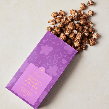 Chocolate Orange Popcorn: Popped Corn (22%), Sugar, Glucose Syrup, Dark Chocolate (15%) (Cocoa Mass, Sugar, Cocoa Butter, Emulsifier: SOYA Lecithin, Natural Vanilla Flavour), Coconut Oil, Orange Peel (1.2%), Salt, Rapeseed Oil, Emulsifier: Sunflower Lecithin, Raising Agent: Bicarbonate of Soda, Natural Flavouring.