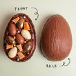· The top layer of this filled Easter egg is adorned with chunks of fudge and mini chocolate eggs, stuffed with rich caramel chocolate ganache.