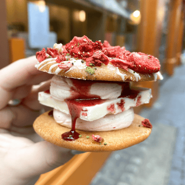 A classic combination of ripe British strawberries, vanilla & cream makes this the perfect summer Biskie. Made with a creamy vanilla & strawberry filling, a handmade strawberry jam core and finished green tea crumb with a fresh strawberry on top for a delicious burst of flavour!