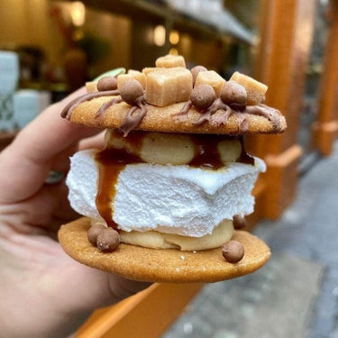 Salted Caramel S'More Biskie: Vanilla Biskie: Caster Sugar; Vanilla Extract with Seeds; Glucose; brown sugar; Salt; baking powder; Wheat flour (GLUTEN); Butter (MILK); Vanilla crumb: Sugar; cornflour; Wheat Flour (GLUTEN); unsalted butter (MILK), whole egg (EGG); Dark Chocolate: cocoa mass, sugar, fat-reduced cocoa powder, emulsifier, soya lecithin, natural vanilla.; Roux: Cornflour, whole milk (MILK); Double Cream (MILK), water.; Whole milk (MILK), Salt, Minimum 80% Milk Fat; Sugar; Marshmallow: Egg white (EGGS), sugar, vanilla extract, Vegi Gel: (Dextrose, Carrageenan, Locust Bean Gum, potassium chloride, calcium acetate(from fruits)), Xantham gum, Glucose; Salted Caramel: Glucose, salt, sugar, Double cream(MILK), unsalted butter (MILK)