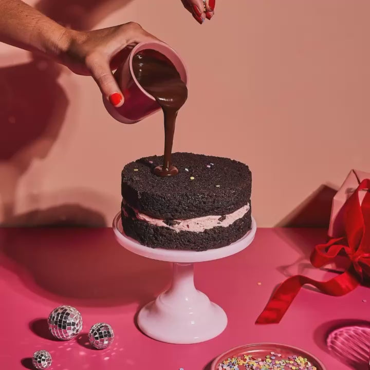 Decadence meets fun in this show-stopping celebration cake. Layers of rich chocolate sponge are sandwiched with tangy raspberry cheesecake buttercream and studded with chunks of fudgy brownie. The best part? Pour over the warm chocolate ganache and let the confetti sprinkles rain down to your heart’s content. It's the perfect mix of luxury and playfulness.