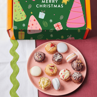 Alongside the Biskies we have included a joyful mix of handmade mini cupcakes and delicate macarons. Our mini cupcakes are bursting with flavour and make the sweetest treat for someone special. The macarons come with their signature crisp shell and luscious fillings of salted caramel, passionfruit and pistachio. A magical little box of Christmas joy.