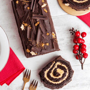 Meet the yule log that has it all; a fudgy, rich chocolate sponge, generously rolled with creamy salted caramel buttercream and encased in velvety chocolate ganache. We’ve lovingly decorated this squidgy log with white chocolate stars and a touch of gold shimmer, so that it’s ready to delight and dazzle at any holiday celebration. Our yule log serves up to 8 loved ones and truly is a Christmas cake that's as indulgent as it is beautiful.