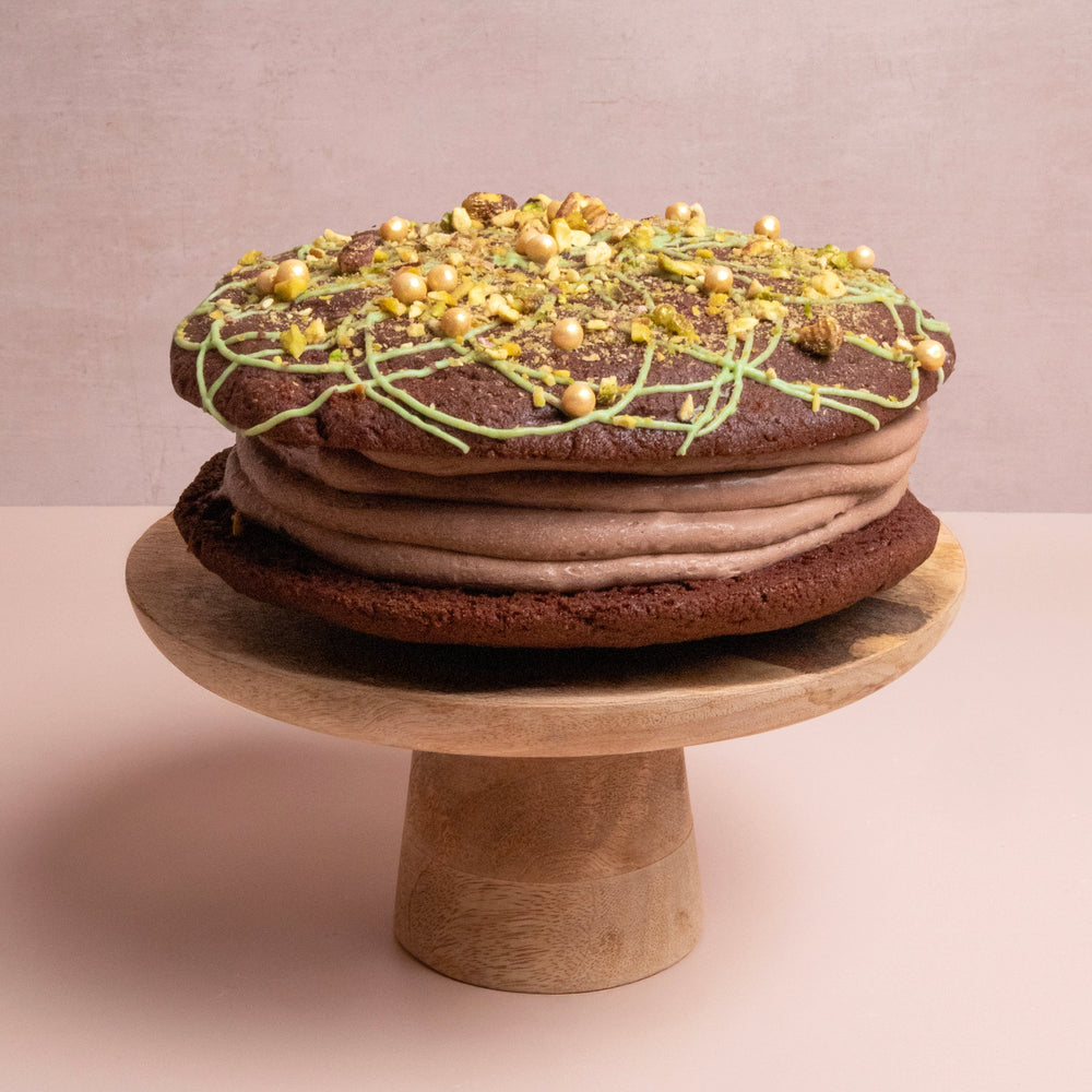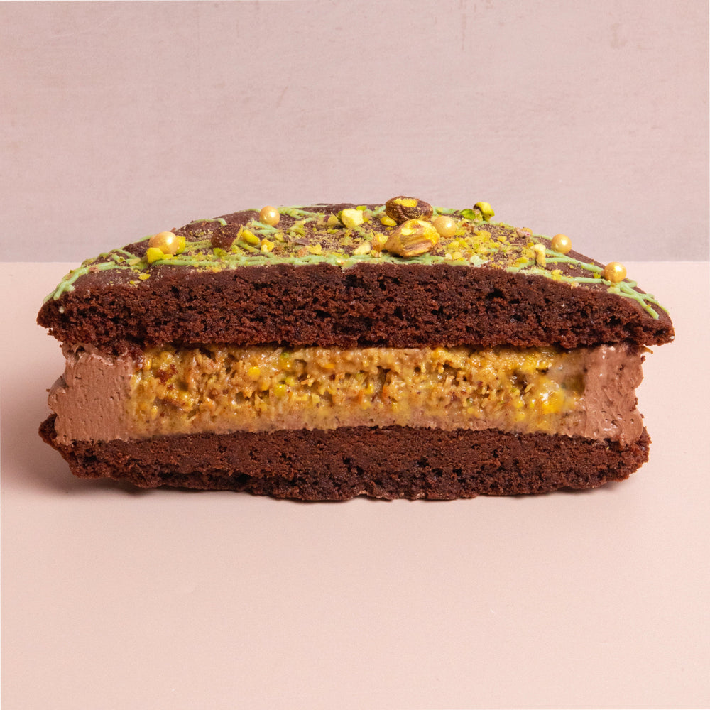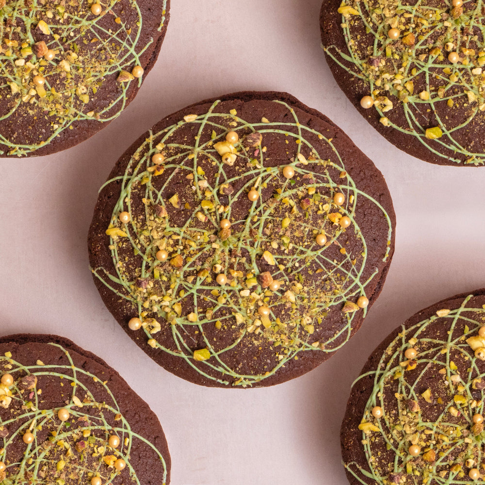 What’s better than a biskie? A giant biskie! Taking inspiration from the viral Dubai pistachio chocolate, we’ve created our own signature bake, a biskie of course, that might just be our most luxurious treat yet. This giant beauty features a rich chocolate Biskie (half biscuit, half cake) sandwiched with dreamy pistachio & kadayif ganache that’s encased with smooth chocolate buttercream. Topped with glossy green chocolate, gold crisp pearls and a sprinkle of crushed pistachios, it’s indulgent, it’s decadent, it’s a taste of Dubai.