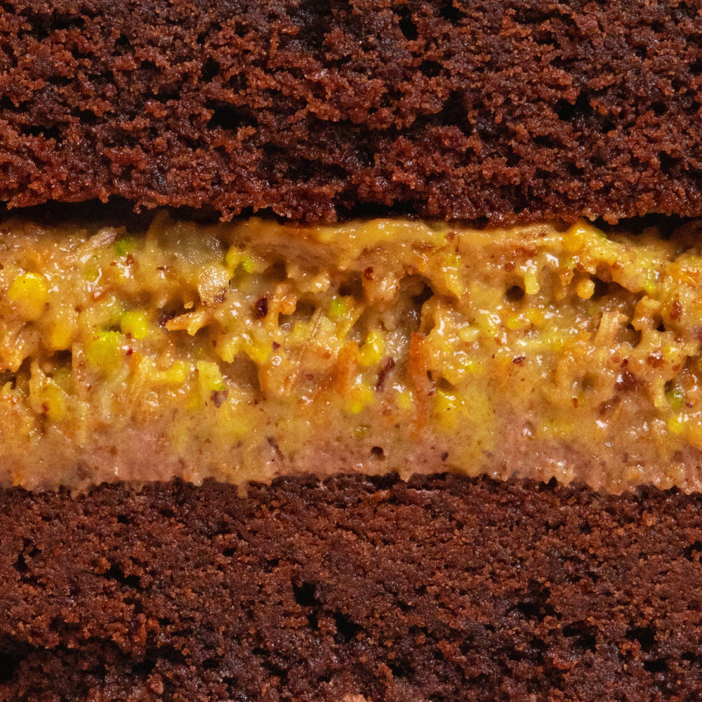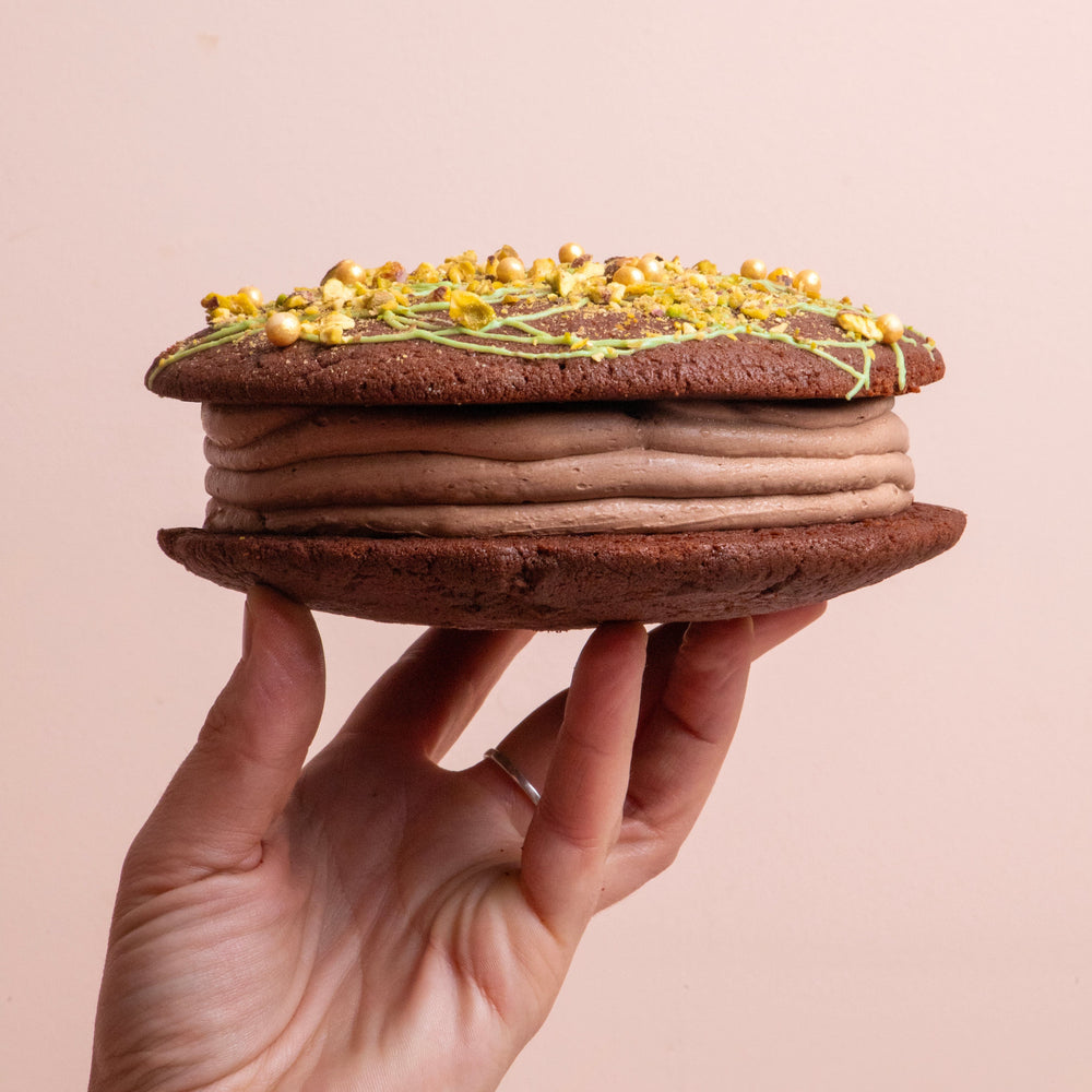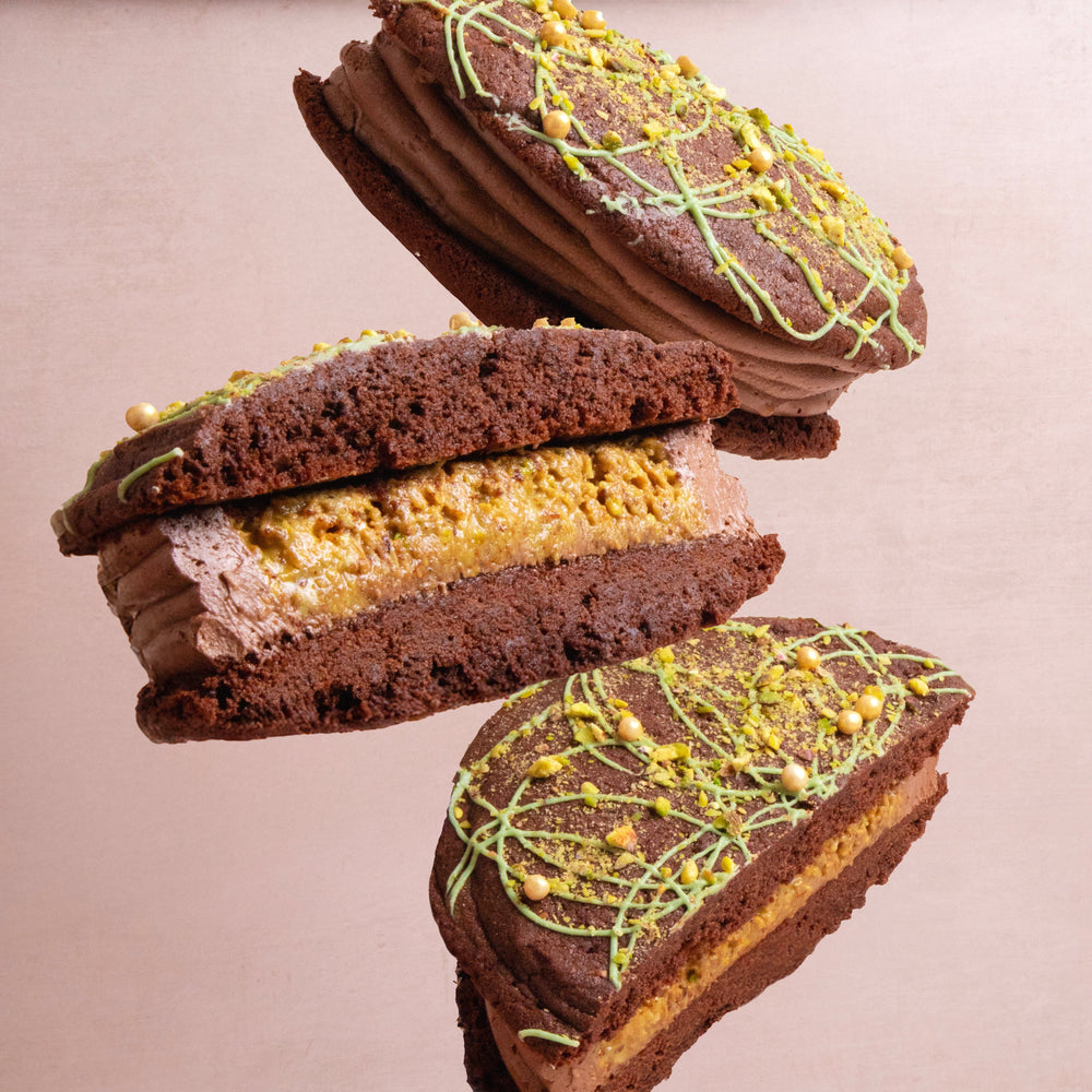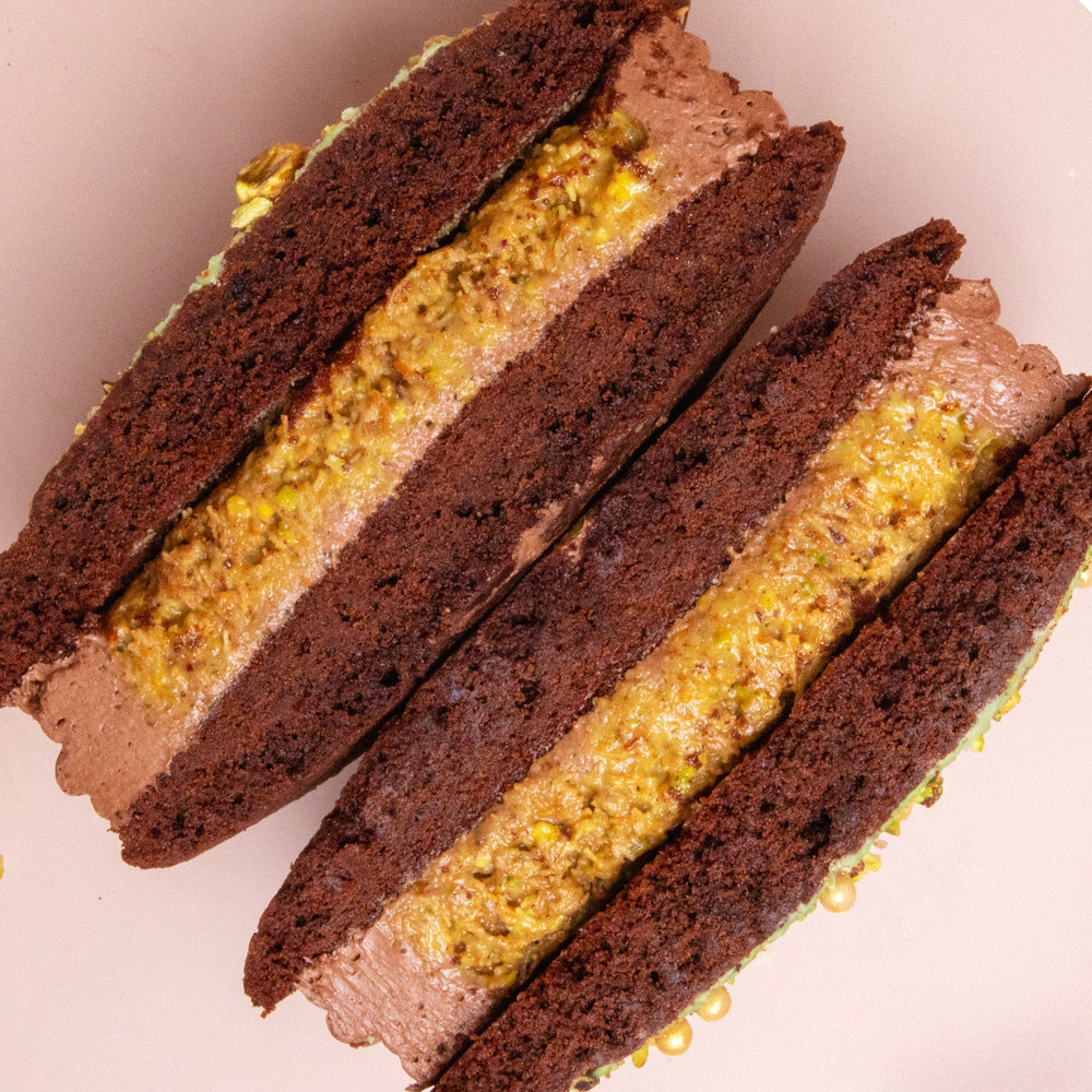 What’s better than a biskie? A giant biskie! Taking inspiration from the viral Dubai pistachio chocolate, we’ve created our own signature bake, a biskie of course, that might just be our most luxurious treat yet. This giant beauty features a rich chocolate Biskie (half biscuit, half cake) sandwiched with dreamy pistachio & kadayif ganache that’s encased with smooth chocolate buttercream. Topped with glossy green chocolate, gold crisp pearls and a sprinkle of crushed pistachios, it’s indulgent, it’s decadent, it’s a taste of Dubai.