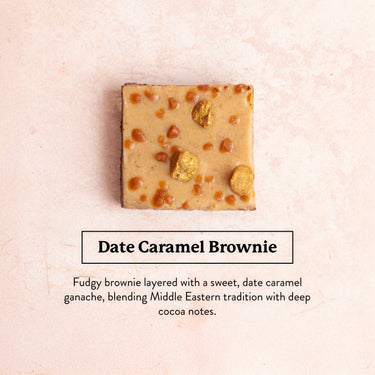 Fudgy brownie layered with a sweet, date caramel ganache, blending Middle Eastern tradition with deep cocoa notes.
