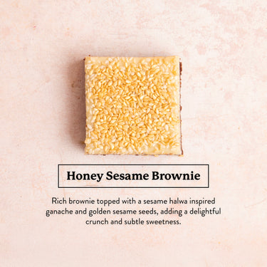 Rich brownie topped with a sesame halwa inspired ganache and golden sesame seeds, adding a delightful crunch and subtle sweetness.