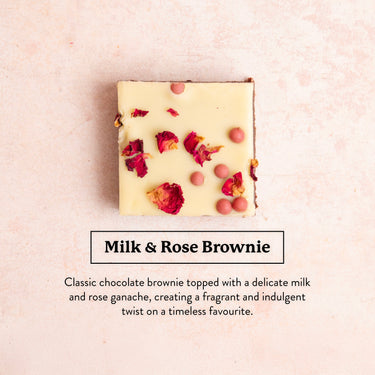 Classic chocolate brownie topped with a delicate milk and rose ganache, creating a fragrant and indulgent twist on a timeless favourite.