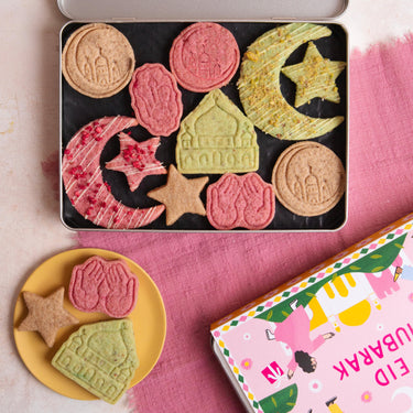 Embrace the spirit of Eid with our Eid Biscuit Tin, a thoughtfully curated collection of shortbread biscuits, shaped to honour the symbols of the season. With a variety of delicious flavours, each biscuit is crafted to reflect the richness of the holy traditions, making it the perfect treat to celebrate Eid ul-Fitr or a meaningful Eid gift for loved ones.
