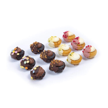 Chocolate Hazelnut (Vegan) - Melt-in-your-mouth chocolate cupcake filled with a delightful hazelnut spread, topped with chocolate buttercream and then dipped in dark chocolate with a scattering of sweet hazelnut bresilienne.