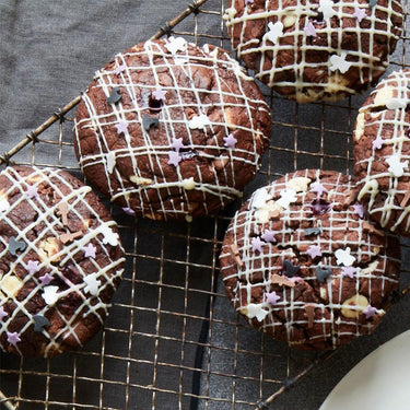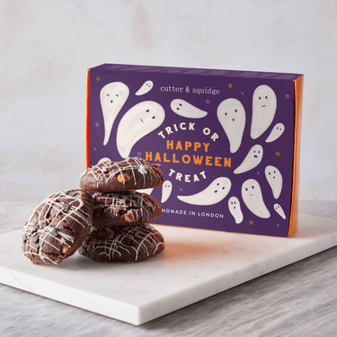 We've given our cookies a twist this spooky season! Each box contains 4 chunky triple chocolate cookies studded with luxury white chocolate, topped with halloween sprinkles and oozing with a raspberry jam centre!