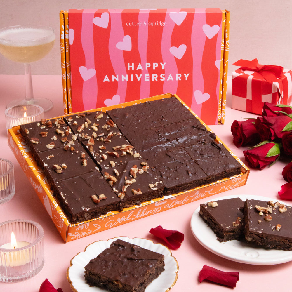 Mark your relationship’s special day with our Happy Anniversary Brownie Box, filled with our bestselling, fudgy brownies and wrapped in a beautifully hand-illustrated gifting sleeve made just for the occasion. Whether you're celebrating one year or fifty, this deliciously indulgent box is the perfect way to say I love you (and I brought brownies!).
