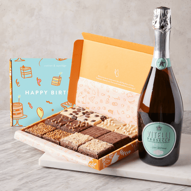 Go full size or go home. Our 'Happy Birthday Brownies and Fizz Bundle' is all that and more. Say 'Happy Birthday' with this delicious box of brownies to your special someone! In this one, we've paired our delicious best-selling brownies in six mouth-watering flavours with a refreshing bottle of Prosecco to celebrate the occasion in style. The brownies are packaged in a beautiful hand illustrated 'Happy Birthday' sleeve to make this the perfect gift, so what are you waiting for? Get your hands on this one asap.