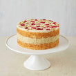 This cake is made up of two moist layers of lemon sponge sandwiched together with zesty lemon buttercream and fruity strawberry raspberry jam. Topped with lemon buttercream and a berry jam swirl, and finished with colourful edible petals and freeze-dried strawberry and raspberry pieces.