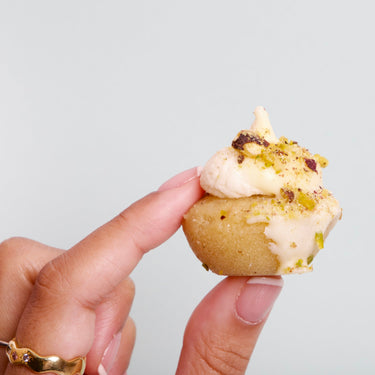 Pistachio & Lemon - Zesty lemon cupcake with a nutty pistachio filling and a lemon buttercream top, dipped in sweet white chocolate and finished with crushed pistachios.