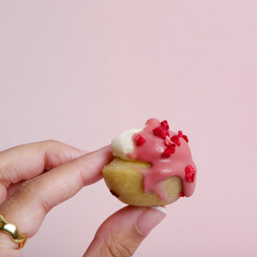 Strawberry & Vanilla - Vanilla cupcake with a fruity strawberry jam filling and a smooth vanilla buttercream top, dipped in ruby chocolate and sprinkled with zingy raspberry crumb.