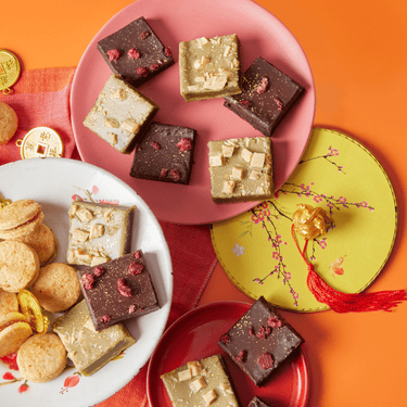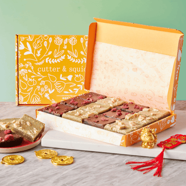 Chewy and chocolatey, these Mochi brownies are a delicious duo designed to celebrate the Lunar New Year. Hand-crafted, vegan, and wheat-free, this Mixed Mochi Brownie box comes with: