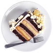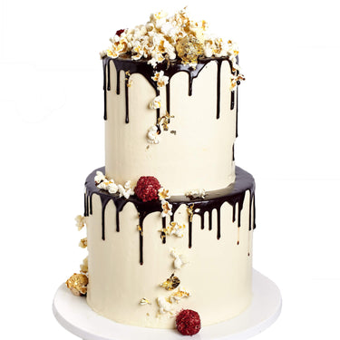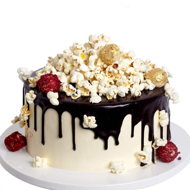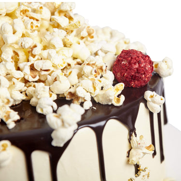 Yaaaaaay, fun in a cake! This showstopper has alternating layers of moist vanilla and chocolate cake filled with a luxurious Belgian chocolate buttercream. Madagascan vanilla buttercream goes on the outside before this cake receives a generous chocolate drip and a mountain of popcorn. Raspberry and gold coated white chocolate spheres finish the design on this signature look cake.