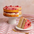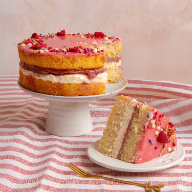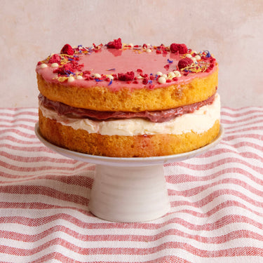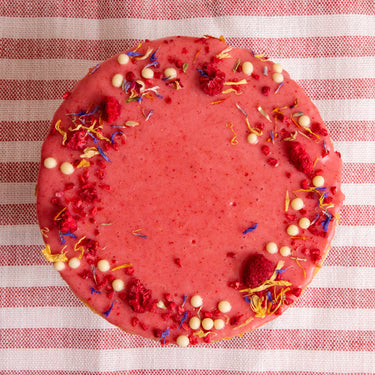 Our Raspberry & Elderflower Cake boasts zesty lemon sponges generously sandwiched with a delicate elderflower buttercream and raspberry elderflower curd. To decorate, pink elderflower icing is adorned with beautiful edible flower petals, crispy white chocolate pearls and raspberries.