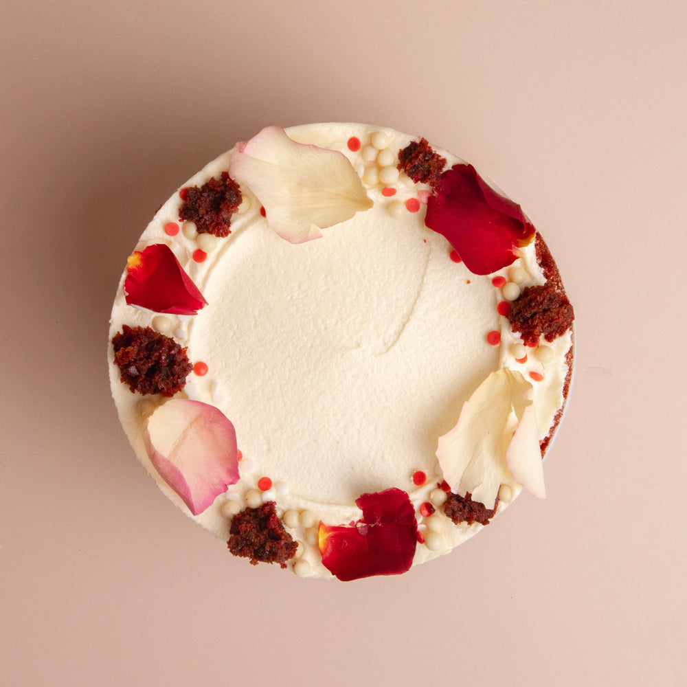 With our Red Velvet Cake you'll discover a luscious, airy chocolate sponge, kissed with the hue of natural red colouring. With every bite, you'll find oodles of our homemade vanilla buttercream. Our Red Velvet Cake is adorned with delicate petals, crisp white pearls, sprinkles and scattered red velvet sponge pieces, adding an extra layer of decadence.