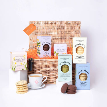 Delivered in a stunning 16" wicker basket and full to the brim with delectable biscuits and tea, our Shortbread and Tea Christmas Hamper is a wonderfully festive gift. With four different flavour shortbreads and two boxes of classic teas, this Christmas hamper will be a real treat to receive, perfect to send as a Christmas gift to anyone in the UK.