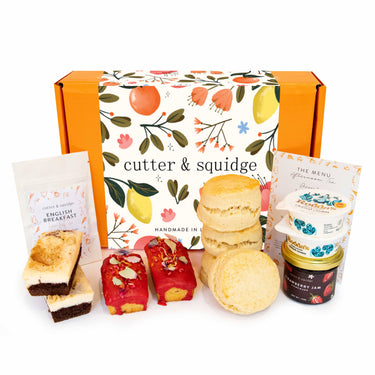 This afternoon tea is best eaten within 2-3 days. If you wish to store it, pop everything (minus the tea) in an airtight container in the fridge. Take out the brownie and cake 1-2 hours before serving, these are best eaten at room temperature. Warm up the scones (180c for 5-7 mins), brew your tea and enjoy!