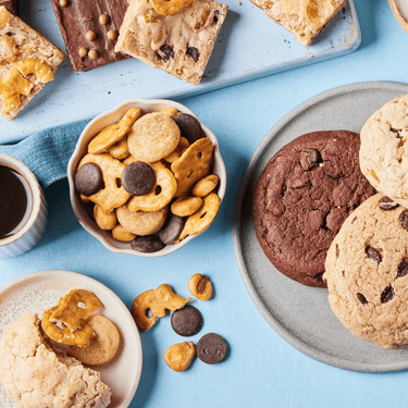 Dark Chocolate Buttons (53%) [41.8% Cocoa mass, 39.8% Sugar, 14.9% Cocoa butter, 3.0% Fat-reduced cocoa powder, Emulsifier (SOYA), Vanilla extract], Salted Pretzels [WHEAT Flour, Sunflower Oil, Sugar, BARLEY Malt Extract, Salt, Emulsifier: SOYA Lecithin, Water, Raising Agent: Sodium Bicarbonate], Fried Salted Corn Snack [86% corn, sunflower oil, salt], Plain Flour [WHEAT Flour (WHEAT Flour, Calcium Carbonate, Niacin, Iron, Thiamine), WHEAT GLUTEN], Vegan Butter [Palm Oil, Rapeseed Oil, Water, Salt, Emulsifiers (Mono and Di-glycerides of Fatty Acids), Flavouring, Vitamins A and D, Colour (Carotenes)], Granulated Sugar, Light Brown Sugar, Puffed Rice Cereal [Rice, Sugar, Malted BARLEY Extract, Salt, Iron, Niacin, Pantothenic Acid, Riboflavin, Vitamin B6, Thiamine, Folic Acid, Vitamin D, Vitamin B12], Vanilla Extract [Water, Granulated Sugar, Glucose Syrup, Glycerine, Vanilla Pods: Sustainably grown vanilla pods (100%)], Bicarbonate of Soda, Baking Powder (WHEAT Starch, Raising Agents: Disodium Diphosphate, Sodium Bicarbonate), Cinnamon Sugar (Granulated Sugar, Ground Cinnamon), Salt: Fine Sea Salt.