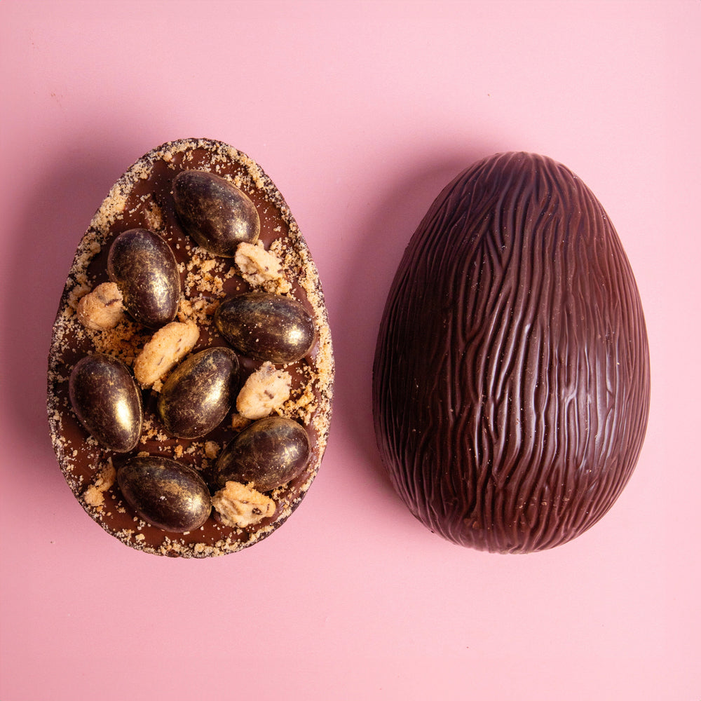 Vegan Easter Egg: Vegan ambient chocolate ganache {Dark Chocolate (sugar, cocoa mass, cocoa butter, emulsifier (SOYA lecithin), natural vanilla flavouring), Rapeseed Oil, Icing Sugar (Sugar), Coconut Oil, Golden Syrup: Partially Inverted Refiners Syrup}, Vegan Caramel {Flora Plant Double Cream [Lentil protein preparation (water, 1.1% lentil flour), coconut fat, rapeseed oil, sugar, modified corn starch, emulsifiers (sunflower lecithin, sugar esters of fatty acids, mono- and diglycerides of fatty acids), stabilizers (guar gum, locust bean gum), natural flavors, salt, colorant (beta-carotene)], Granulated Sugar, Glucose Syrup, Vegan Butter [Palm Oil, Rapeseed Oil, Water, Salt, Emulsifiers (Mono and Di-glycerides of Fatty Acids), Flavouring, Vitamins A and D, Colour (Carotenes)], Maldon Salt: Sea Salt Flakes}, Dark Chocolate Shell {Cocoa Mass (44,8%), Sugar (41,8%), Cocoa Butter (12,9%), Emulsifier SOYA Lecithin, Natural Vanilla Flavouring}, Dark Chocolate Mini Egg [Cocoa mass (40%), sugar (40%), cocoa butter (20%), emulsifier: SOYA LECITHIN], Vegan Cookie Bites {Plain Flour [WHEAT Flour (WHEAT Flour, Calcium Carbonate, Niacin, Iron, Thiamine)], Vegan Butter [Palm Oil, Rapeseed Oil, Water, Salt, Emulsifiers (Mono and Di-glycerides of Fatty Acids), Flavouring, Vitamins A and D, Colour (Carotenes)], Granulated Sugar, Rapeseed Oil, Light Brown Sugar, Dark Chocolate Shavings [sugar, cocoa mass (43%), cocoa butter (7%), emulsifier (SOYA lecithin), natural vanilla flavouring), Water, Vanilla Extract Mix [Water, Granulated Sugar, Glucose Syrup, Glycerine, Vanilla Pods: Sustainably grown vanilla pods (100%)], Baking Powder [Sodium Acid pyrophosphate, sodium hydrogen carbonate, WHEAT flour (With Calcium, Iron, Niacin, Thiamine)], Bicarbonate of Soda, Salt: Fine Sea Salt}, Digestive Vegan Crumb Mix {Plain Flour [WHEAT Flour (WHEAT Flour, Calcium Carbonate, Niacin, Iron, Thiamine)], Coconut Oil, Light Brown Sugar, Granulated Sugar, Salt: Fine Sea Salt}, Honeycomb {Granulated Sugar, Glucose Syrup, Water, Sodium Bicarbonate, Maldon Salt: Sea Salt Flakes}, Gold Dust (Colouring agents: Titanium dioxide, Red Iron Oxide, Stabiliser: Potassium aluminium silicate).