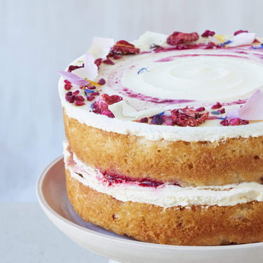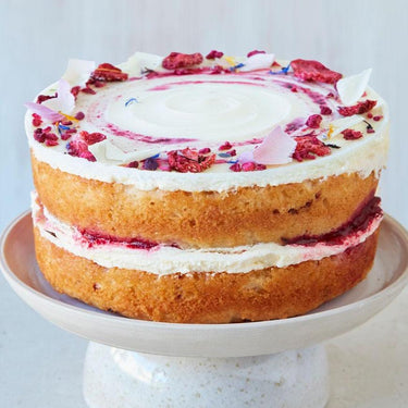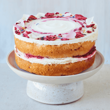 This cake is made up of two moist layers of lemon sponge sandwiched together with zesty lemon buttercream and fruity strawberry raspberry jam. Topped with lemon buttercream and a berry jam swirl, and finished with colourful edible petals and freeze-dried strawberry and raspberry pieces. Yum!!
