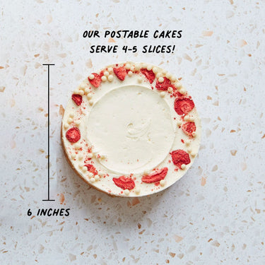 All of our postable cakes are 6" and serve approx. 5 - 6 slices.