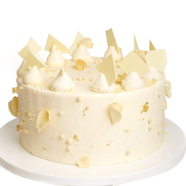 Our beautiful white and cream sprinkle cake is adorned with sprinkles, chocolate pearls, touches of real gold and topped with chocolate shards. Filled with layers of alternating chocolate and vanilla sponge, chocolate buttercream. This cake will taste as good as it looks.